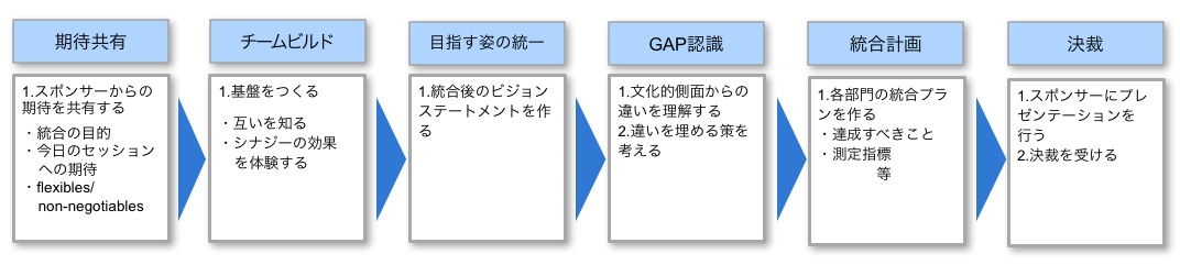 両社の統合部門の部門長の真剣なディスカションと共同作業を促して、統合後の事業部が「心技体」すべての面で一枚岩になるようなプランを作り上げるために、Hさんが社長と握ったセッションのアジェンダは以下とおりでした。