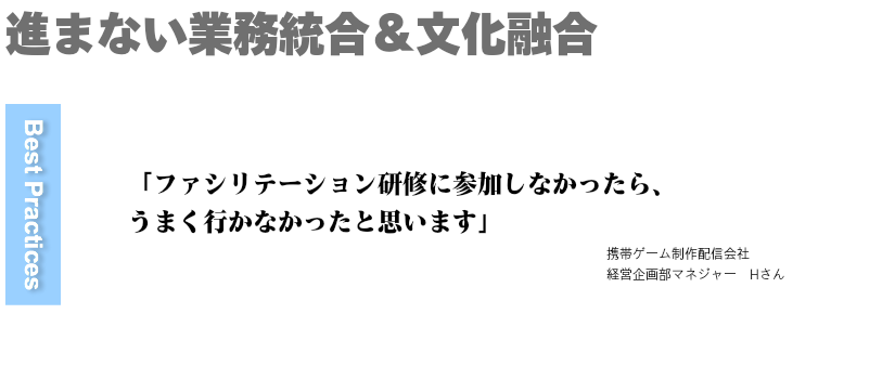 主導権をもっていたのはA社。見かけ上の器の統合は事務的に粛々と進んでいましたが、現場の統合はまったく手がつけられていませんでした。X-dayに向けていたずらに時間が過ぎていくだけでした。